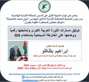 دعوة لحضور محاضرة الدكتور إبراهيم بظاظو ” توثيق مسارات الثورة العربية الكبرى ونمذجتها رقمياً ووضعها على الخارطة السياحية باستخدام GIS “